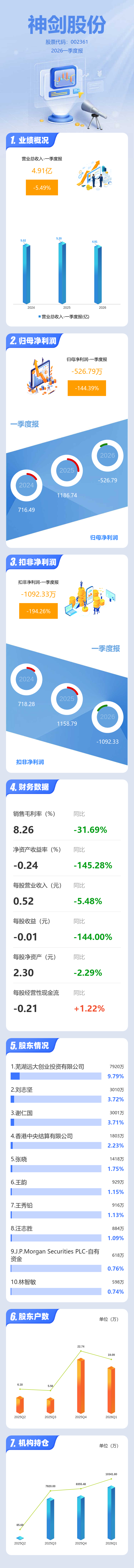 证券之星消息,神剑股份2026年一季报显示,一季度公司主营收入4.91亿元,同比下降5.49%;归母净利润-526.79万元,同比下降144.39%;扣非净利润-1092.33万元,同比下降194.26%;负债率51.73%,投资收益105.24万元,财务费用1158.38万元,毛利率8.26%。