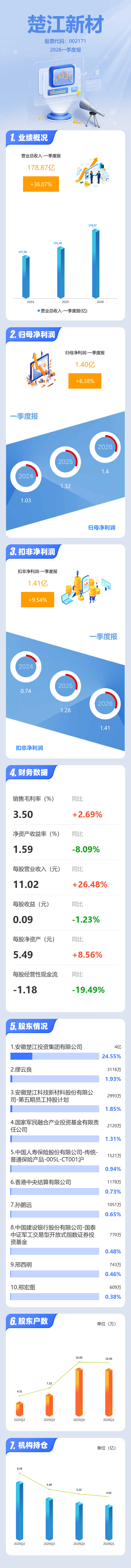 证券之星消息,楚江新材2026年一季报显示,一季度公司主营收入178.87亿元,同比上升36.07%;归母净利润1.4亿元,同比上升6.39%;扣非净利润1.41亿元,同比上升9.55%;负债率59.6%,投资收益1436.6万元,财务费用5804.35万元,毛利率3.5%。