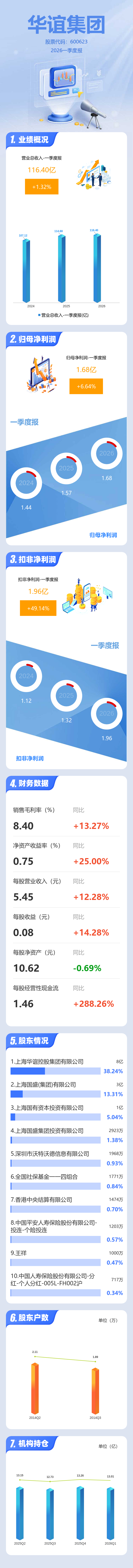 证券之星消息,华谊集团2026年一季报显示,一季度公司主营收入116.4亿元,同比上升1.32%;归母净利润1.68亿元,同比上升6.64%;扣非净利润1.96亿元,同比上升49.14%;负债率56.85%,投资收益7282.39万元,财务费用9688.62万元,毛利率8.4%。