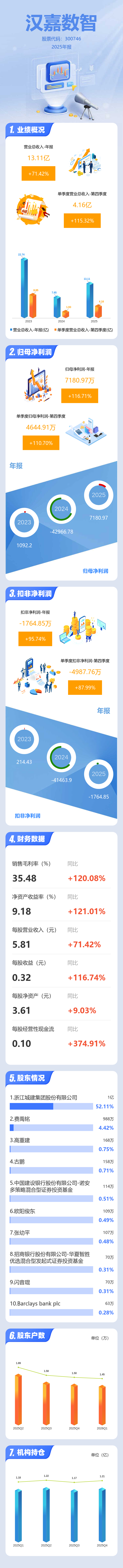 证券之星消息,汉嘉数智2025年年报显示,当年度公司主营收入13.11亿元,同比上升71.43%;归母净利润7180.97万元,同比上升116.71%;扣非净利润-1764.85万元,同比上升95.74%;其中2025年第四季度,公司单季度主营收入4.16亿元,同比上升115.33%;单季度归母净利润4644.91万元,同比上升110.7%;单季度扣非净利润-4987.76万元,同比上升87.99%;负债率67.12%,投资收益1.14亿元,财务费用2773.27万元,毛利率35.48%。