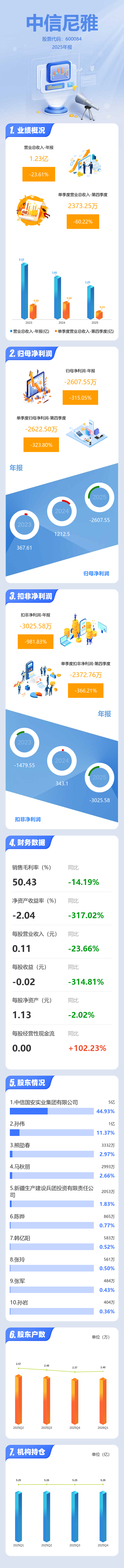 证券之星消息,中信尼雅2025年年报显示,当年度公司主营收入1.23亿元,同比下降23.62%;归母净利润-2607.55万元,同比下降315.06%;扣非净利润-3025.58万元,同比下降981.84%;其中2025年第四季度,公司单季度主营收入2373.25万元,同比下降60.23%;单季度归母净利润-2622.5万元,同比下降323.8%;单季度扣非净利润-2372.76万元,同比下降366.21%;负债率14.78%,投资收益275.51万元,财务费用99.18万元,毛利率50.43%。