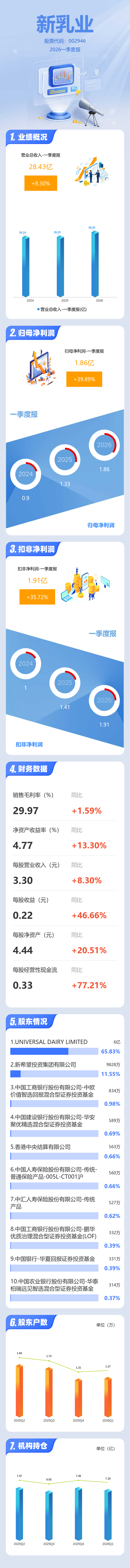 证券之星消息,新乳业2026年一季报显示,一季度公司主营收入28.43亿元,同比上升8.31%;归母净利润1.86亿元,同比上升39.89%;扣非净利润1.91亿元,同比上升35.73%;负债率55.29%,投资收益-121.23万元,财务费用1935.84万元,毛利率29.97%。