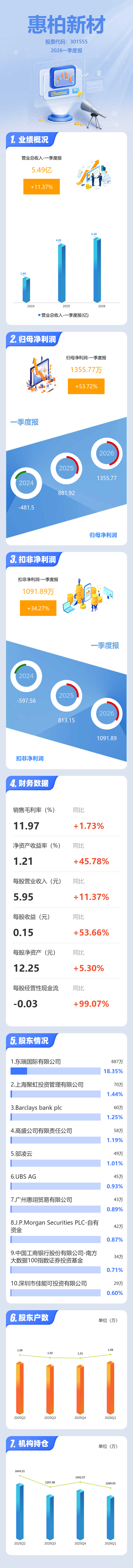 证券之星消息,惠柏新材2026年一季报显示,一季度公司主营收入5.49亿元,同比上升11.37%;归母净利润1355.77万元,同比上升53.73%;扣非净利润1091.89万元,同比上升34.28%;负债率62.77%,投资收益27.61万元,财务费用541.59万元,毛利率11.97%。