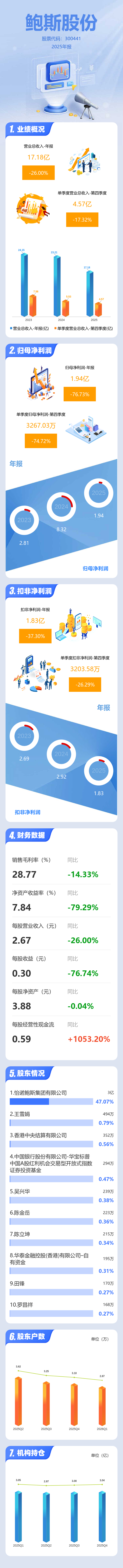证券之星消息,鲍斯股份2025年年报显示,当年度公司主营收入17.18亿元,同比下降26.01%;归母净利润1.94亿元,同比下降76.74%;扣非净利润1.83亿元,同比下降37.3%;其中2025年第四季度,公司单季度主营收入4.57亿元,同比下降17.33%;单季度归母净利润3267.03万元,同比下降74.73%;单季度扣非净利润3203.58万元,同比下降26.3%;负债率31.84%,投资收益42.68万元,财务费用288.53万元,毛利率28.77%。