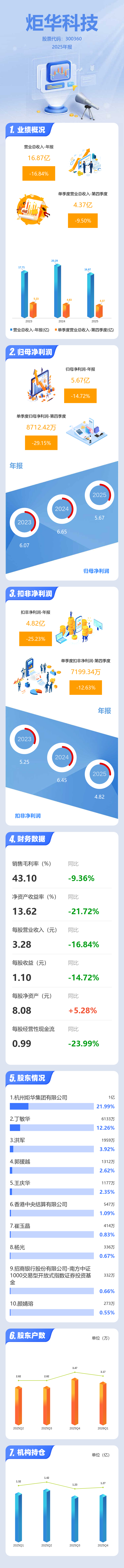 证券之星消息,炬华科技2025年年报显示,当年度公司主营收入16.87亿元,同比下降16.85%;归母净利润5.67亿元,同比下降14.72%;扣非净利润4.82亿元,同比下降25.24%;其中2025年第四季度,公司单季度主营收入4.37亿元,同比下降9.51%;单季度归母净利润8712.42万元,同比下降29.15%;单季度扣非净利润7199.34万元,同比下降12.63%;负债率15.3%,投资收益7860.98万元,财务费用-7510.47万元,毛利率43.1%。