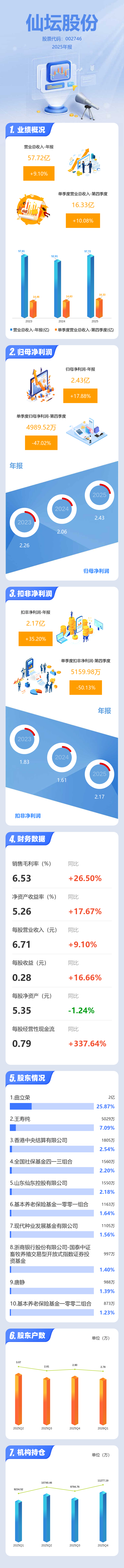 证券之星消息,仙坛股份2025年年报显示,当年度公司主营收入57.72亿元,同比上升9.1%;归母净利润2.43亿元,同比上升17.89%;扣非净利润2.17亿元,同比上升35.21%;其中2025年第四季度,公司单季度主营收入16.33亿元,同比上升10.08%;单季度归母净利润4989.52万元,同比下降47.02%;单季度扣非净利润5159.98万元,同比下降50.14%;负债率41.78%,投资收益2531.25万元,财务费用-3554.59万元,毛利率6.53%。