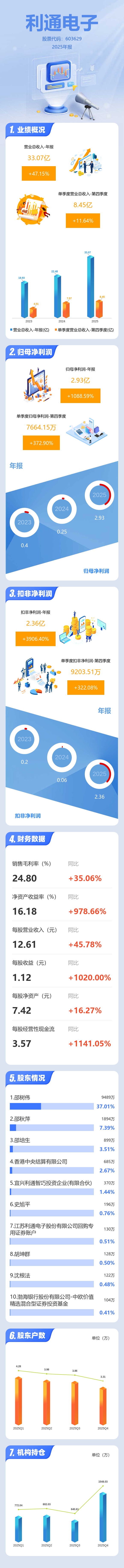 证券之星消息,利通电子2025年年报显示,当年度公司主营收入33.07亿元,同比上升47.16%;归母净利润2.93亿元,同比上升1088.59%;扣非净利润2.36亿元,同比上升3906.41%;其中2025年第四季度,公司单季度主营收入8.45亿元,同比上升11.64%;单季度归母净利润7664.15万元,同比上升372.9%;单季度扣非净利润9203.51万元,同比上升322.09%;负债率69.03%,投资收益-477.44万元,财务费用8380.61万元,毛利率24.8%。