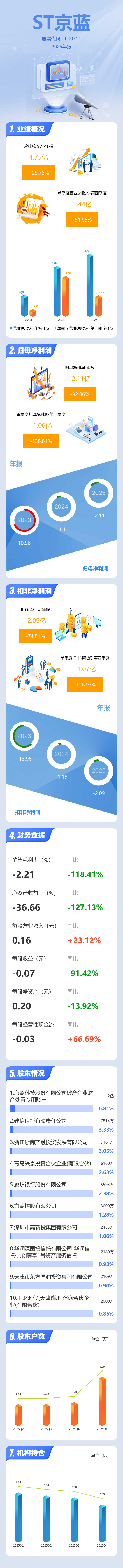 证券之星消息,ST京蓝2025年年报显示,当年度公司主营收入4.75亿元,同比上升25.76%;归母净利润-2.11亿元,同比下降92.07%;扣非净利润-2.09亿元,同比下降74.81%;其中2025年第四季度,公司单季度主营收入1.44亿元,同比下降51.66%;单季度归母净利润-1.06亿元,同比下降138.85%;单季度扣非净利润-1.07亿元,同比下降126.98%;负债率52.52%,投资收益97.0万元,财务费用361.84万元,毛利率-2.21%。