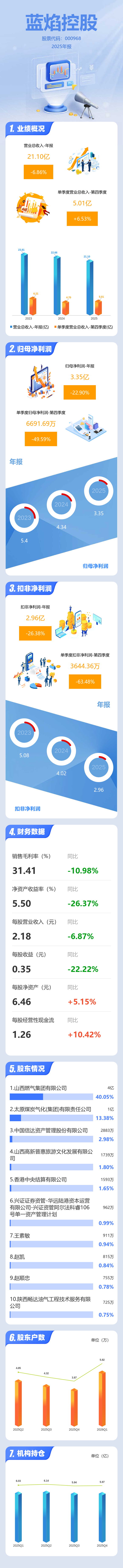 证券之星消息,蓝焰控股2025年年报显示,当年度公司主营收入21.1亿元,同比下降6.87%;归母净利润3.35亿元,同比下降22.9%;扣非净利润2.96亿元,同比下降26.38%;其中2025年第四季度,公司单季度主营收入5.01亿元,同比上升6.54%;单季度归母净利润6691.69万元,同比下降49.59%;单季度扣非净利润3644.36万元,同比下降63.48%;负债率43.4%,财务费用9807.81万元,毛利率31.41%。