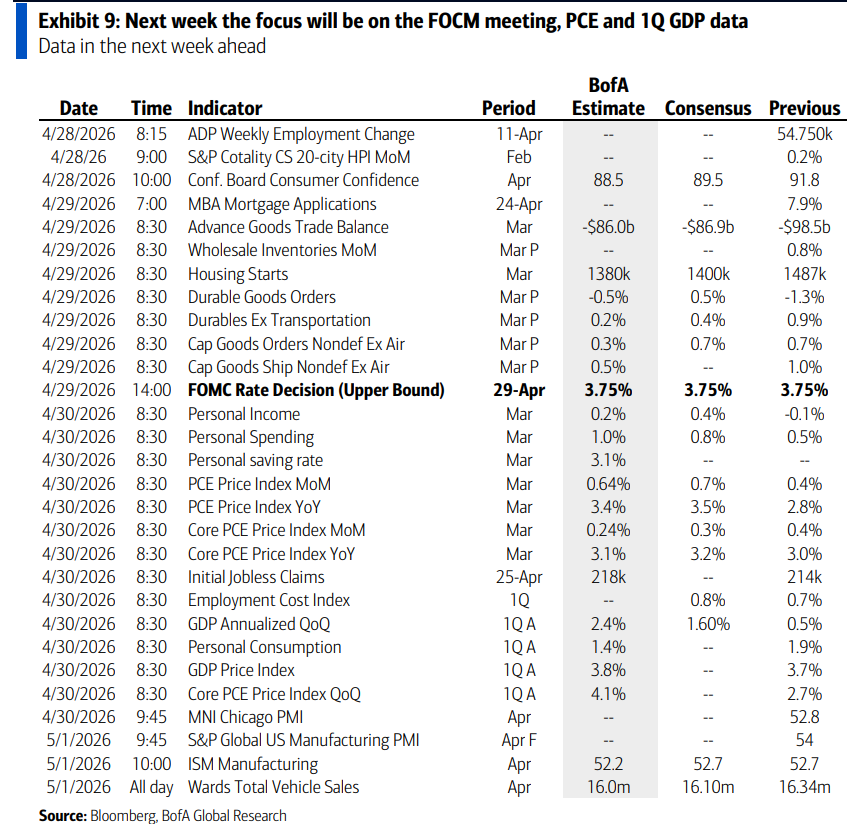 数据层面,分析师预测4月30日公布的一季度GDP年化增速为2.4%(市场共识为1.6%),核心PCE同比预计为3.1%。通胀仍在高位,这正是鲍威尔难以转鸽的根本原因。