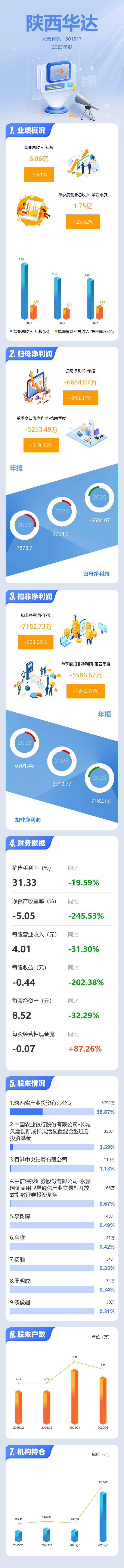 证券之星消息,陕西华达2025年年报显示,当年度公司主营收入6.06亿元,同比下降3.82%;归母净利润-6684.07万元,同比下降243.31%;扣非净利润-7182.73万元,同比下降293.1%;其中2025年第四季度,公司单季度主营收入1.75亿元,同比上升23.53%;单季度归母净利润-5253.49万元,同比下降519.54%;单季度扣非净利润-5586.67万元,同比下降1242.75%;负债率39.7%,投资收益-116.24万元,财务费用743.75万元,毛利率31.33%。
