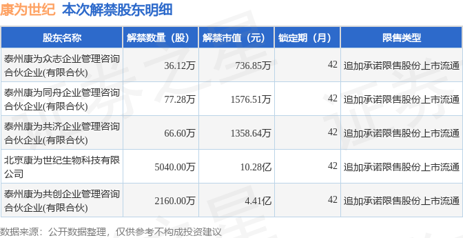证券之星消息,根据市场公开信息整理,康为世纪(688426)于4月27日将有7380.0万股限售股份解禁,为公司追加承诺限售股份上市流通,占公司总股本65.6%。(本次数据根据历史公告整理得出,实际情况以上市公司最新公告为准)最近一年内,该股累计解禁43.42万股,占总股本的0.39%。本次解禁后,公司还有26.61万股限售股份,占总股本0.24%。具体如下图所示:
