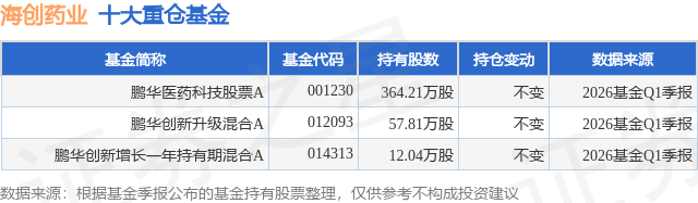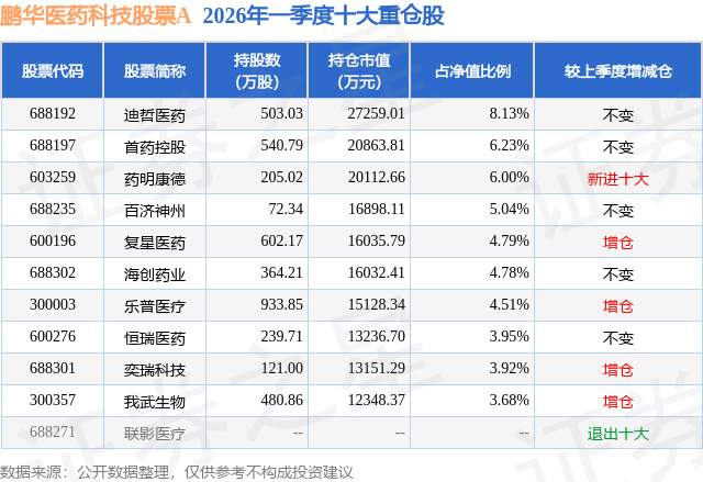 根据2026基金Q1季报公募基金重仓股数据,重仓该股的公募基金共3家,其中持有数量最多的公募基金为鹏华基金的鹏华医药科技股票A。鹏华医药科技股票A目前规模为16.53亿元,最新净值1.6872(4月24日),较上一交易日下跌0.5%,近一年上涨24.07%。该公募基金现任基金经理为金笑非。金笑非在任的基金产品包括:鹏华创新升级混合A,管理时间为2021年6月18日至今,期间收益率为54.27%;鹏华创新增长一年持有期混合A,管理时间为2022年6月21日至今,期间收益率为72.05%;鹏华医疗保健股票,管理时间为2024年4月27日至今,期间收益率为16.42%。