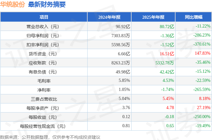 据证券之星公开数据整理,近期华统股份(002840)发布2025年年报。根据财报显示,华统股份净利润同比下降286.23%。截至本报告期末,公司营业总收入80.72亿元,同比下降11.22%,归母净利润-1.36亿元,同比下降286.23%。按单季度数据看,第四季度营业总收入19.84亿元,同比下降23.88%,第四季度归母净利润-2.07亿元,同比下降1155.46%。