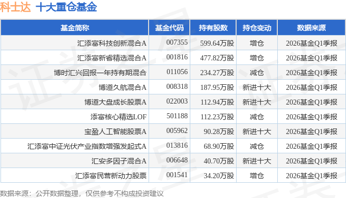 持有科士达最多的基金为汇添富科技创新混合A,目前规模为71.5亿元,最新净值4.4893(4月27日),较上一交易日上涨1.83%,近一年上涨110.23%。该基金现任基金经理为马翔。