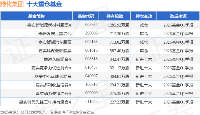 持有雅化集团最多的基金为嘉实新能源新材料股票A,目前规模为31.51亿元,最新净值3.2982(4月27日),较上一交易日上涨0.56%,近一年上涨93.48%。该基金现任基金经理为姚志鹏。