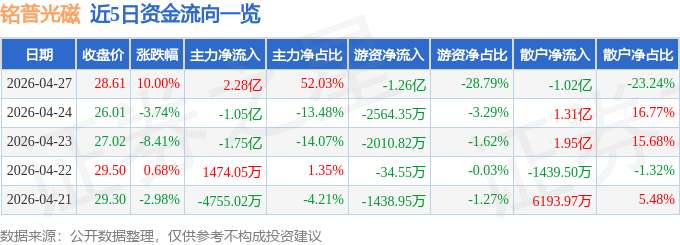 4月27日的资金流向数据方面,主力资金净流入2.28亿元,占总成交额52.03%,游资资金净流出1.26亿元,占总成交额28.79%,散户资金净流出1.02亿元,占总成交额23.24%。