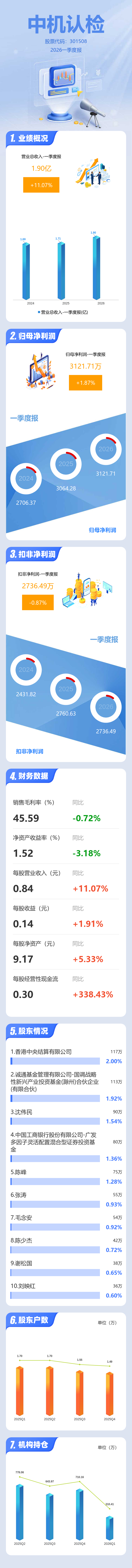 证券之星消息,中机认检2026年一季报显示,一季度公司主营收入1.9亿元,同比上升11.07%;归母净利润3121.71万元,同比上升1.87%;扣非净利润2736.49万元,同比下降0.87%;负债率22.02%,投资收益71.08万元,财务费用169.33万元,毛利率45.59%。