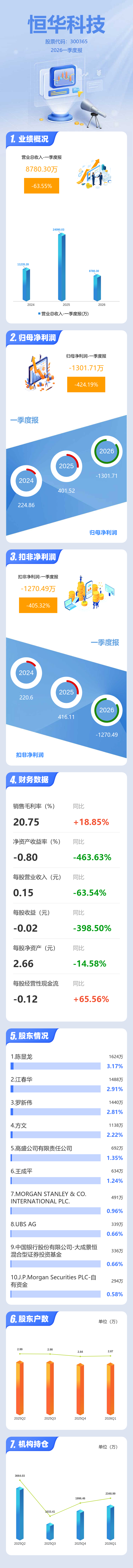 证券之星消息,恒华科技2026年一季报显示,一季度公司主营收入8780.3万元,同比下降63.55%;归母净利润-1301.71万元,同比下降424.2%;扣非净利润-1270.49万元,同比下降405.33%;负债率18.67%,投资收益-20.21万元,财务费用-33.03万元,毛利率20.75%。