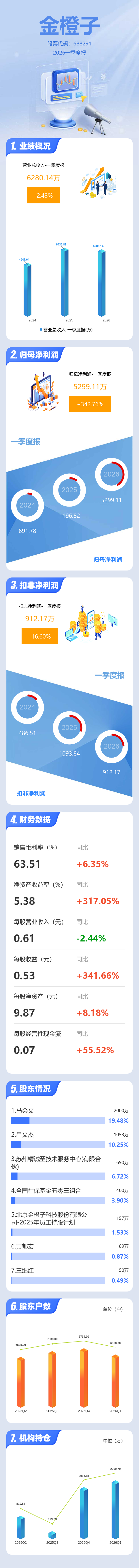 证券之星消息,金橙子2026年一季报显示,一季度公司主营收入6280.14万元,同比下降2.43%;归母净利润5299.11万元,同比上升342.76%;扣非净利润912.17万元,同比下降16.61%;负债率7.62%,投资收益5111.51万元,财务费用-83.41万元,毛利率63.51%。