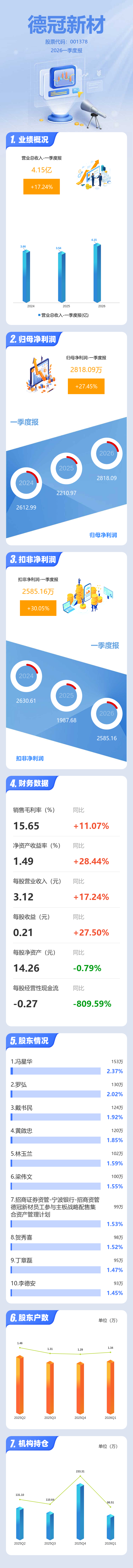 证券之星消息,德冠新材2026年一季报显示,一季度公司主营收入4.15亿元,同比上升17.24%;归母净利润2818.09万元,同比上升27.46%;扣非净利润2585.16万元,同比上升30.06%;负债率20.74%,投资收益395.96万元,财务费用158.02万元,毛利率15.65%。
