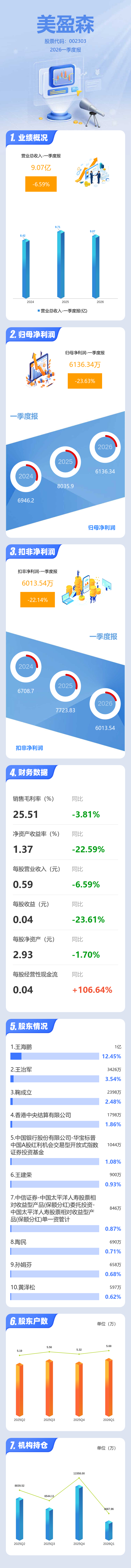 证券之星消息,美盈森2026年一季报显示,一季度公司主营收入9.07亿元,同比下降6.6%;归母净利润6136.34万元,同比下降23.64%;扣非净利润6013.54万元,同比下降22.14%;负债率36.18%,投资收益21.23万元,财务费用842.71万元,毛利率25.51%。