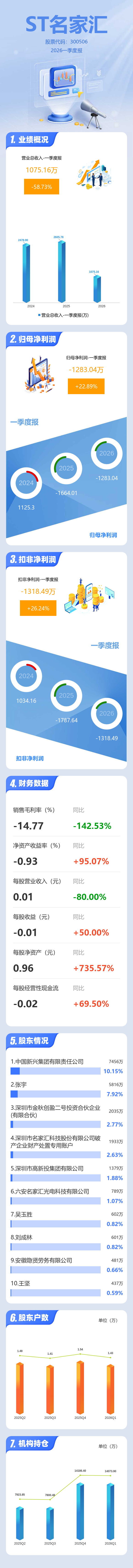 证券之星消息,ST名家汇2026年一季报显示,一季度公司主营收入1075.16万元,同比下降58.74%;归母净利润-1283.04万元,同比上升22.89%;扣非净利润-1318.49万元,同比上升26.24%;负债率10.04%,投资收益-0.03万元,财务费用-148.21万元,毛利率-14.77%。