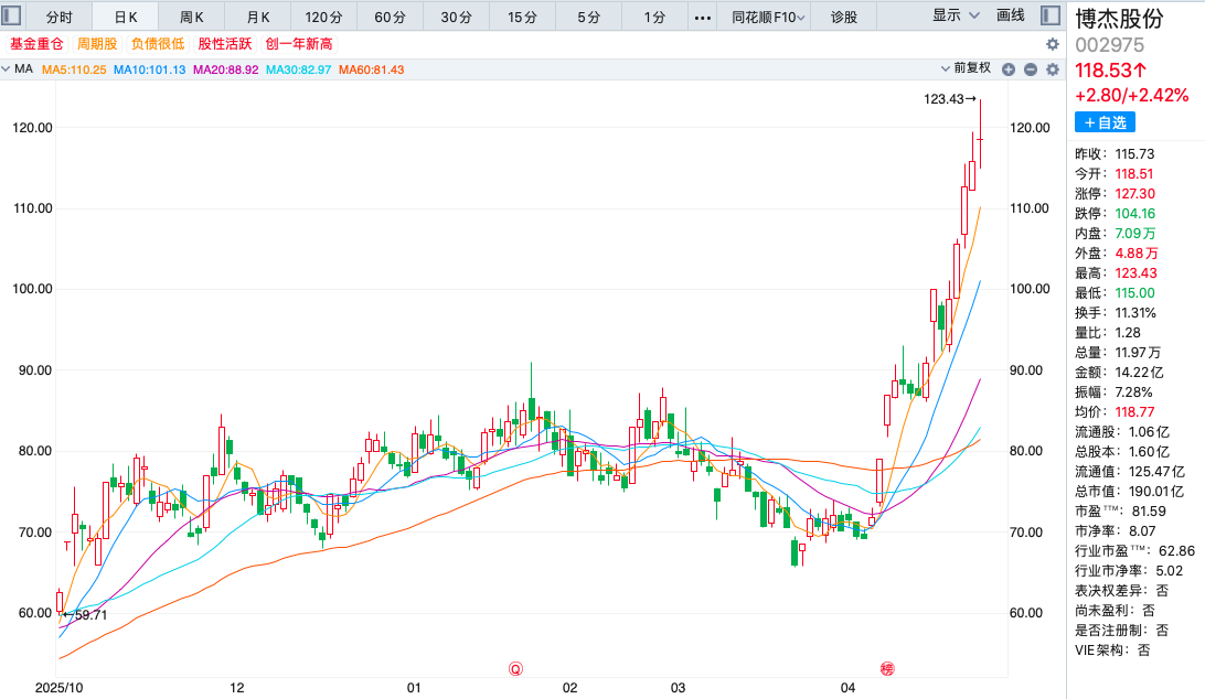 博杰股份股价今日盘中最高涨至123.43元/股,创多个月以来的新高,截至发稿报118.53元/股,涨幅超2.42%,总市值190亿元。4月以来,该公司股价涨近70%。值得一提的是,4月27日,有投资者在互动平台提问博杰股份:公司或子公司是否给台积电供货?传闻独家供应台积电CoWoS封装产线,漏液检测精度达0.1mL/min(行业平均1mL/min)是否属实?对此,博杰股份回复:公司与该客户暂无直接业务合作。 港股频道更多独家策划、专家专栏,免费查阅>> 责任编辑:栎树