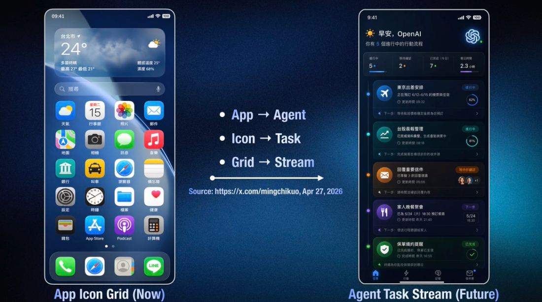 郭明𫓹称,AI智能体重新定义手机,用户的目的不再是使用一堆应用程序,而是通过手机执行任务并满足各种需求。这从根本上改变了对手机的认知。 郭明𫓹还给出了手机界面概念设计图,并与当前手机(以iPhone为例)进行对比。
