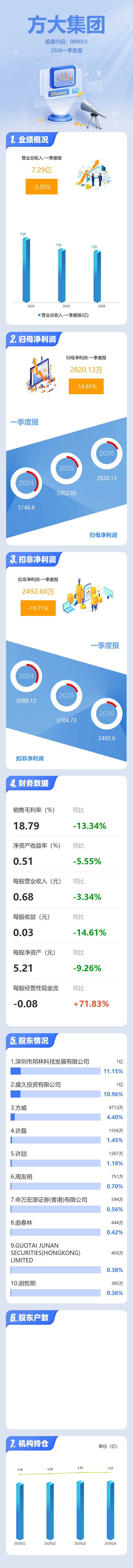 证券之星消息,方大集团2026年一季报显示,一季度公司主营收入7.29亿元,同比下降3.36%;归母净利润2820.13万元,同比下降14.61%;扣非净利润2492.6万元,同比下降19.72%;负债率53.31%,投资收益-56.66万元,财务费用2380.15万元,毛利率18.79%。