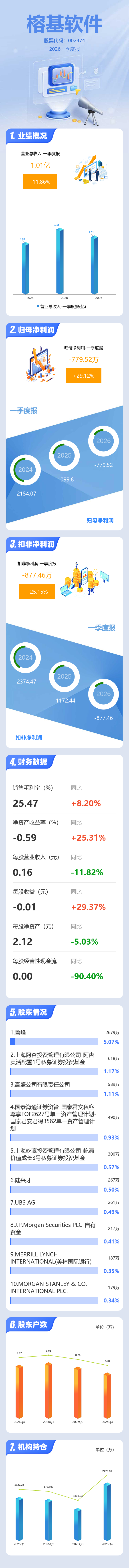 证券之星消息,榕基软件2026年一季报显示,一季度公司主营收入1.01亿元,同比下降11.86%;归母净利润-779.52万元,同比上升29.12%;扣非净利润-877.46万元,同比上升25.16%;负债率45.54%,投资收益226.87万元,财务费用423.08万元,毛利率25.47%。