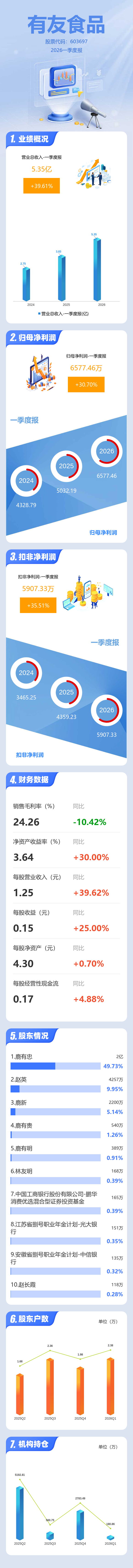 证券之星消息,有友食品2026年一季报显示,一季度公司主营收入5.35亿元,同比上升39.62%;归母净利润6577.46万元,同比上升30.71%;扣非净利润5907.33万元,同比上升35.51%;负债率24.19%,投资收益472.71万元,财务费用-16.33万元,毛利率24.26%。