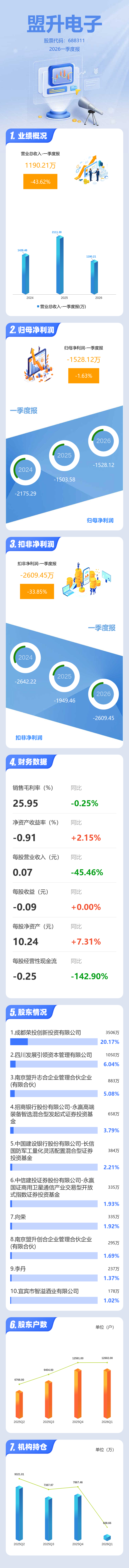 证券之星消息,盟升电子2026年一季报显示,一季度公司主营收入1190.21万元,同比下降43.63%;归母净利润-1528.12万元,同比下降1.63%;扣非净利润-2609.45万元,同比下降33.85%;负债率24.33%,投资收益833.29万元,财务费用181.36万元,毛利率25.95%。