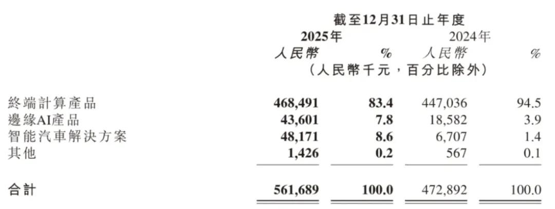 爱芯元智2025年来自终端计算产品收入4.69亿,较上年同期增长4.8%;自边缘AI产品收入为4360万元,较上年同期的1860万元增长134.6%,主要是由于迅速扩张的市场推动;自智能汽车解决方案的收入为4820万元,较上年同期的670万元增长618.2%,主要由于过去获得定点的终端客户车型于2025年正式进入量产阶段,从而推动芯片出货量大幅攀升。