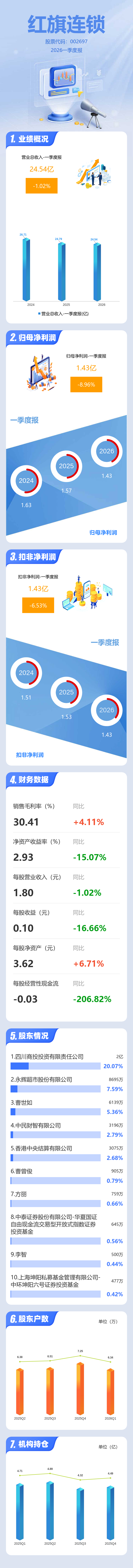 证券之星消息,红旗连锁2026年一季报显示,一季度公司主营收入24.54亿元,同比下降1.03%;归母净利润1.43亿元,同比下降8.97%;扣非净利润1.43亿元,同比下降6.53%;负债率41.36%,投资收益4061.31万元,财务费用1091.46万元,毛利率30.41%。