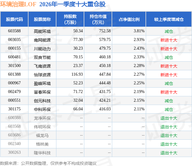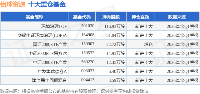 根据2026基金Q1季报公募基金重仓股数据,重仓该股的公募基金共7家,其中持有数量最多的公募基金为汇添富基金的环境治理LOF。环境治理LOF目前规模为1.38亿元,最新净值0.6089(4月24日),较上一交易日下跌0.73%,近一年上涨26.14%。该公募基金现任基金经理为赖中立。赖中立在任的基金产品包括:汇添富优选回报混合A,管理时间为2017年5月18日至今,期间收益率为101.61%;汇添富中证光伏产业指数增强发起式A,管理时间为2021年10月26日至今,期间收益率为-37.08%;汇添富中证科创创业50指数增强发起式A,管理时间为2022年3月29日至今,期间收益率为63.63%;汇添富华证专精特新100指数发起式A,管理时间为2025年10月24日至今,期间收益率为12.85%。