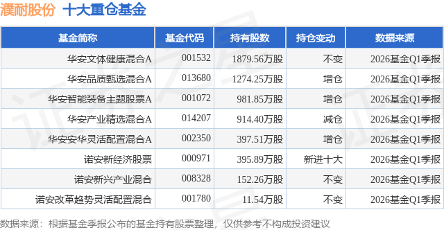 根据2026基金Q1季报公募基金重仓股数据,重仓该股的公募基金共8家,其中持有数量最多的公募基金为华安基金的华安文体健康混合A。华安文体健康混合A目前规模为20.49亿元,最新净值5.337(4月24日),较上一交易日下跌2.7%,近一年上涨67.25%。该公募基金现任基金经理为刘畅畅 桑翔宇。刘畅畅在任的基金产品包括:华安安华灵活配置混合A,管理时间为2021年8月10日至今,期间收益率为76.65%;华安产业精选混合A,管理时间为2021年12月29日至今,期间收益率为45.04%;华安品质甄选混合A,管理时间为2022年7月21日至今,期间收益率为45.76%。桑翔宇在任的基金产品包括:华安医药生物股票发起式A,管理时间为2024年12月25日至今,期间收益率为54.27%;华安汇宏精选混合A,管理时间为2025年5月6日至今,期间收益率为146.33%;华安安进灵活配置混合发起式A,管理时间为2025年9月1日至今,期间收益率为60.14%。