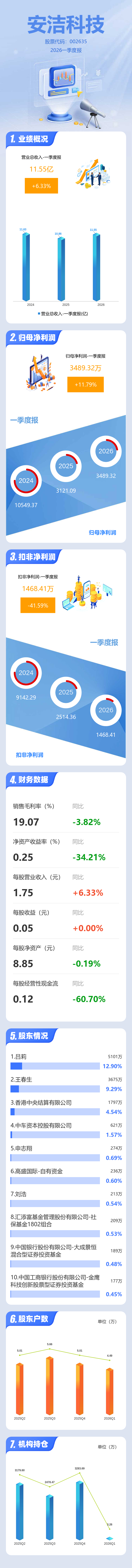 证券之星消息,安洁科技2026年一季报显示,一季度公司主营收入11.55亿元,同比上升6.33%;归母净利润3489.32万元,同比上升11.8%;扣非净利润1468.41万元,同比下降41.6%;负债率29.18%,投资收益2103.0万元,财务费用1835.16万元,毛利率19.07%。
