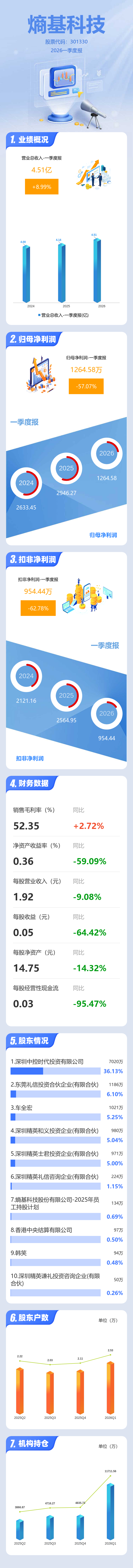 证券之星消息,熵基科技2026年一季报显示,一季度公司主营收入4.51亿元,同比上升9.0%;归母净利润1264.58万元,同比下降57.08%;扣非净利润954.44万元,同比下降62.79%;负债率26.08%,投资收益281.86万元,财务费用1157.69万元,毛利率52.35%。