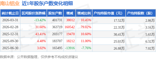 证券之星消息,近日南山铝业披露,截至2026年3月31日公司股东户数为40.17万户,较2月28日增加3.8万户,增幅为10.45%。户均持股数量由上期的3.16万股减少至2.86万股,户均持股市值为17.52万元。
