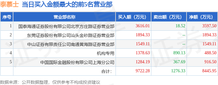 证券之星消息,沪深交易所2026年4月28日公布的交易公开信息显示,泰慕士(001234)因日振幅值达到15%的前5只证券登上龙虎榜。此次是近5个交易日内第3次上榜。