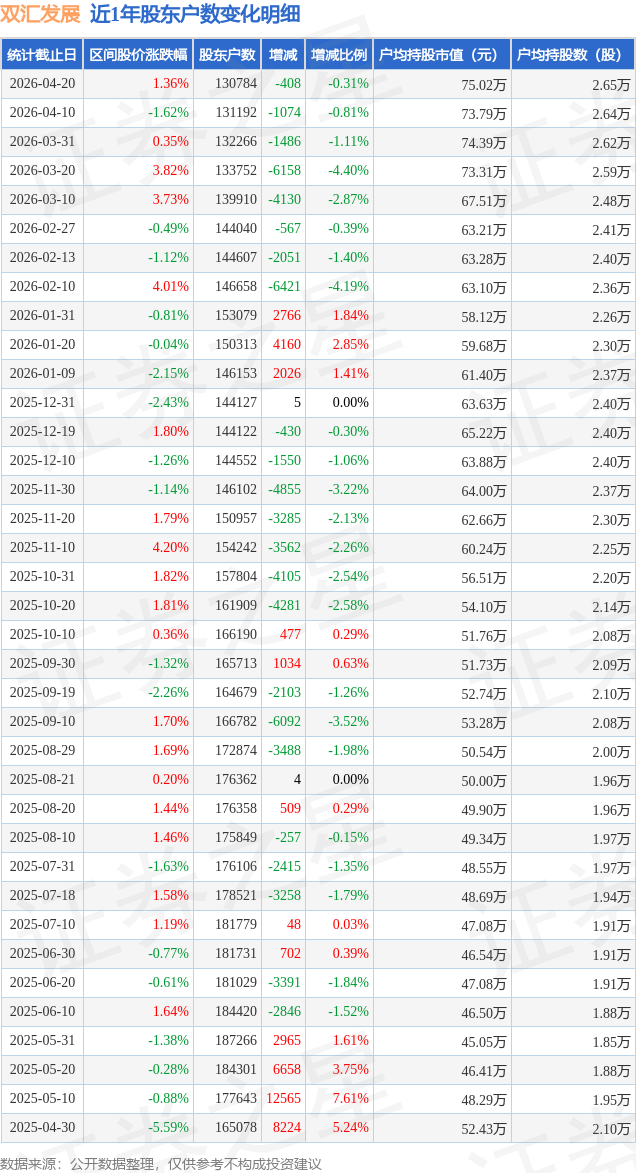 证券之星消息,近日双汇发展披露,截至2026年4月20日公司股东户数为13.08万户,较4月10日减少408.0户,减幅为0.31%。户均持股数量由上期的2.64万股增加至2.65万股,户均持股市值为75.02万元。