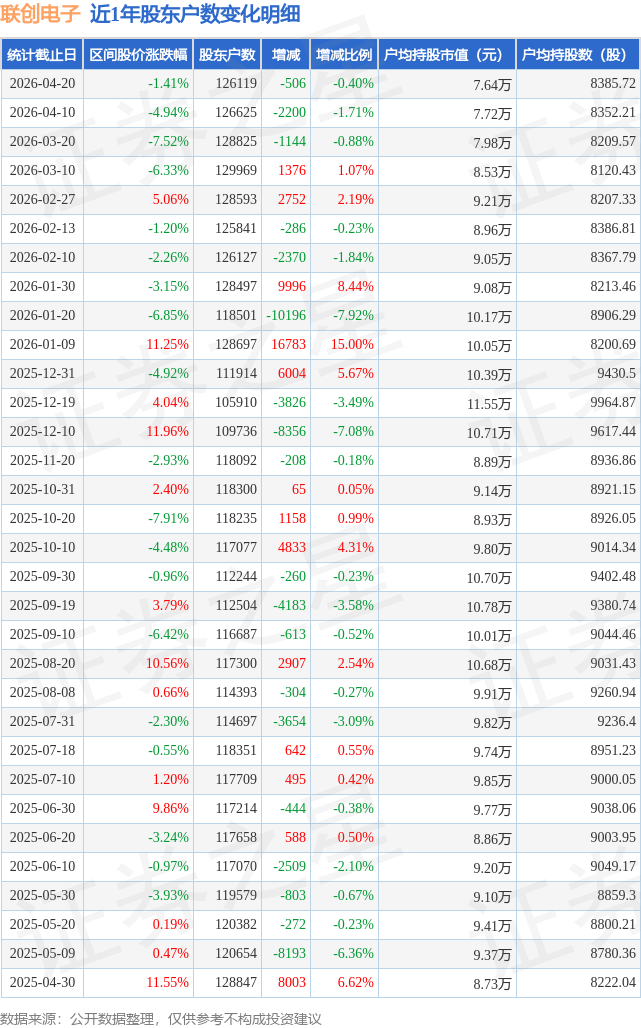 从股价来看,2026年4月10日至2026年4月20日,联创电子区间跌幅为1.41%,在此期间股东户数减少506.0户,减幅为0.4%。