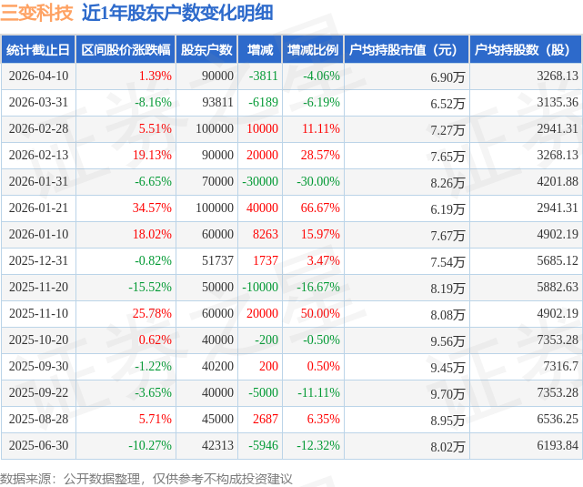 证券之星消息,近日三变科技披露,截至2026年4月10日公司股东户数为9.0万户,较3月31日减少3811.0户,减幅为4.06%。户均持股数量由上期的3135.0股增加至3268.0股,户均持股市值为6.9万元。