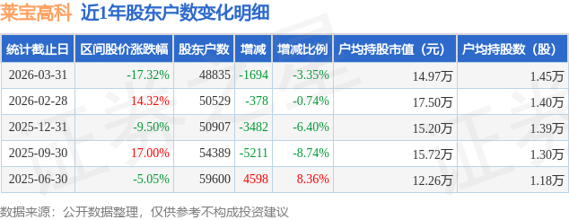 从股价来看,2026年2月28日至2026年3月31日,莱宝高科区间跌幅为17.32%,在此期间股东户数减少1694.0户,减幅为3.35%。