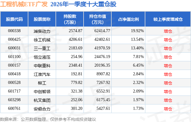 根据2026基金Q1季报公募基金重仓股数据,重仓该股的公募基金共138家,其中持有数量最多的公募基金为广发基金的工程机械ETF广发。工程机械ETF广发目前规模为31.33亿元,最新净值1.685(4月27日),较上一交易日上涨0.35%,近一年上涨31.11%。该公募基金现任基金经理为姚曦。姚曦在任的基金产品包括:消费ETF广发,管理时间为2022年10月19日至今,期间收益率为-19.11%;材料ETF广发,管理时间为2022年11月15日至今,期间收益率为53.92%;能源ETF广发,管理时间为2022年11月15日至今,期间收益率为43.61%;稀有金属ETF广发,管理时间为2023年1月10日至今,期间收益率为64.02%。