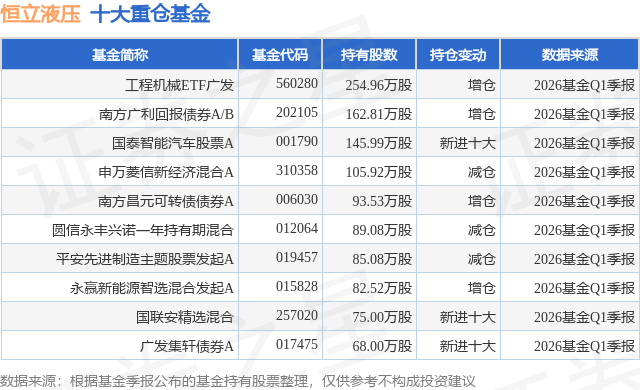 重仓恒立液压的前十大公募基金请见下表: