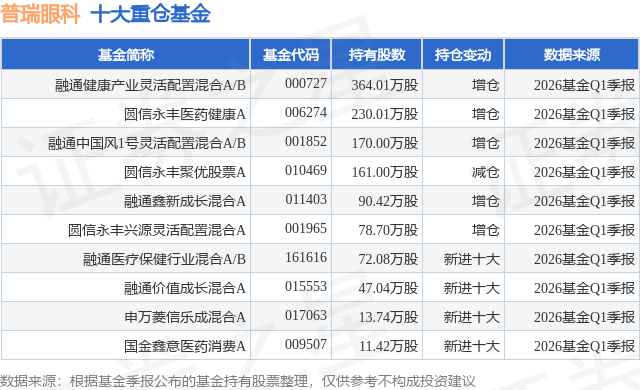 根据2026基金Q1季报公募基金重仓股数据,重仓该股的公募基金共11家,其中持有数量最多的公募基金为融通基金的融通健康产业灵活配置混合A/B。融通健康产业灵活配置混合A/B目前规模为14.07亿元,最新净值2.671(4月27日),较上一交易日上涨0.26%,近一年上涨14.1%。该公募基金现任基金经理为万民远。万民远在任的基金产品包括:融通鑫新成长混合A,管理时间为2021年10月8日至今,期间收益率为35.73%;融通价值成长混合A,管理时间为2022年7月18日至今,期间收益率为30.98%;融通远见价值一年持有期混合A,管理时间为2023年7月18日至今,期间收益率为36.29%。