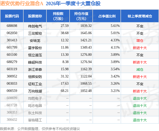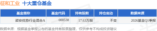 根据2026基金Q1季报公募基金重仓股数据,重仓该股的公募基金共1家,其中持有数量最多的公募基金为诺安基金的诺安优势行业混合A。诺安优势行业混合A目前规模为2.99亿元,最新净值0.981(4月27日),较上一交易日上涨0.62%,近一年上涨15.55%。该公募基金现任基金经理为邓心怡。邓心怡在任的基金产品包括:诺安平衡混合A,管理时间为2022年10月15日至今,期间收益率为60.05%;诺安稳健回报混合A,管理时间为2023年6月3日至今,期间收益率为82.28%;诺安研究优选混合A,管理时间为2025年3月6日至今,期间收益率为102.41%。