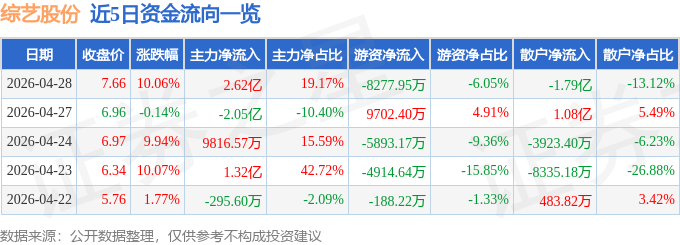 证券之星消息,综艺股份4月28日涨停收盘,收盘价7.66元。该股于9点57分涨停,未打开涨停,截止收盘封单资金为1.29亿元,占其流通市值1.29%。